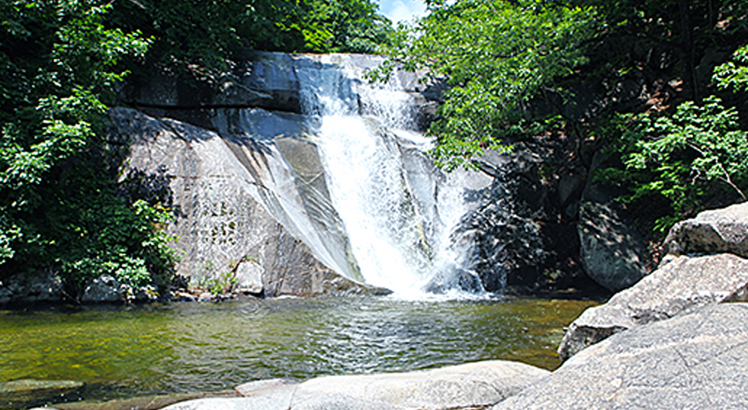 폭포 근처에 그늘이 드리워진 평상이 있어